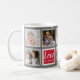 Un fotomontaje de moda Navidades Mug para dar como un regalo de vacaciones para la familia. Personalice la moderna taza de amor de alegría con 8 fotos y su nombre familiar.