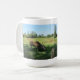 Escena de bonito con un antílope de pastoreo con cuernos grandes. Un pasto verde y árboles en el fondo.