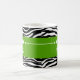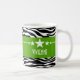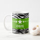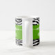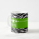 Moderno y moderno Sassy Star Zebra Mug con fondo de cebra en blanco y negro de moda y un audaz borde verde de cuadros adornado con un divertido motivo estrella. Este diseño ondulado puede ser personalizado con el texto personalizado de su elección. Haga clic en "Personalizar" para encontrar más opciones de personalización.