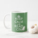 Ésta es la obra clásica "guarda calma y continúa" el poster de la guerra, repetido "guarde la calma y lea en". Ha escrito en blanco en fondo coloreado, y es acompañada por una silueta de un libro a un lado.