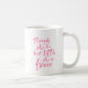 Mug blanca con un elegante guión de pincel rosa de la cita "aunque sea pequeña es feroz" de A MidSummer Night's Dream de William Shakespeare. *Tenga en cuenta que la marca de agua Zazzle que aparece en la vista previa del zoom NO aparecerá en el producto impreso final. © Rosewood y Citrus