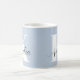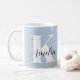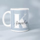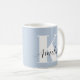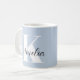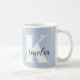 Mug azul claro personalizado con tu monograma inicial en la moderna tipografía blanca grande y tu nombre en un guión elegante.