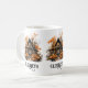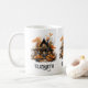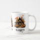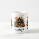 Una taza con un ilustracion fresco y espeluznante de una casa embrujada de madera. Rodeado de grandes calabazas naranjas y árboles con hojas naranjas. Las ventanas con luces naranjas le dan un buen resplandor. Diseño divertido de Halloween.