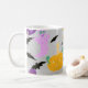 Este caprichoso tazón de café presenta colores y fantasmas no tradicionales de Halloween, telarañas, setas, murciélagos y flores.