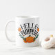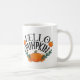 A cute hello pumpkin fall mug design. Perfect for Thanksgiving, celebrating autumn, and the cozy vibe we need when the weather turns brisk! Time for pumpkin lattes and hot chocolate. Burt orange wood, foliage, and pumpkin with bow.