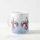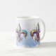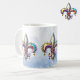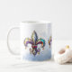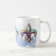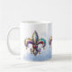 Selección de estilos de taza, incluyendo el vidrio. Personalizable dentro del color para otros estilos. Fleur de Lis con piedra decorativa en el centro sobre nubes transparentes azules.