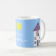 Taza blanca casera dulce casera adaptable con un ilustracion lindo del dibujo animado de una casa bonita con un par joven y sus mascotas que miran fuera de las ventanas en un día soleado en un fondo azul con la frontera de la lila. Un regalo dulce y adorable del estreno de una casa para una familia que acaba de moverse o para nuevamente un par del casar. ¡También una taza de la diversión para los agentes inmobiliarios! Usted puede mover, volver a clasificar según el tamaño, o quitar elementos uces de los del diseño. El texto, la fuente, el color de fondo y la frontera son adaptables. Elija el estilo, el color y el tamaño de su taza. Si usted necesita alguna ayuda en modificar su producto para requisitos particulares me entra en contacto con por favor a través de mi tienda y seré más que feliz de ayudar.