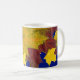 Un tazón de café blanco con un collage de hojas de otoño coloridas sobre un fondo azul profundo.