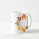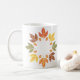 Hojas amarillas, naranjas, marrones y verdes dispuestas en círculo.