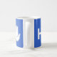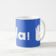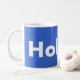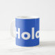 El fondo azul famoso con "Hola" imprimió en blanco y mano que agitaba en el lado.