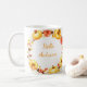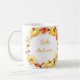 Encantadora taza de café otoñal con una corona acuática de calabazas, bellotas y hojas. La corona forma un borde circular, dejando un centro limpio para texto personalizado o nombres. Perfecto y acogedor tazón otoño para café, té o chocolate caliente y un regalo de temporada ideal.
