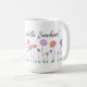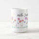 Esta taza de bonito está cubierta de flores extrañas a mano y un saludo Hello Sunshine para ayudarte a empezar tu día. 15 oz de capacidad. Arte original de Carol Kristensen.