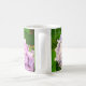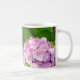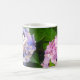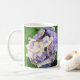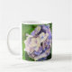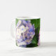 Una fotografía de hortensias azules y moradas en una taza de café.