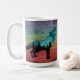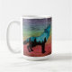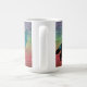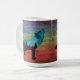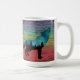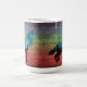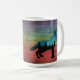 Con un arcoiris de colores para el fondo, un lobo aullante con pinos y cielo azul