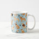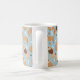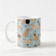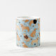 Perros adorables de Golden Retriever con abrigos oscuros y claros se sientan y se paran con huesos de perro dispersos y huellas en un fondo azul.
