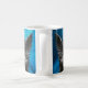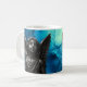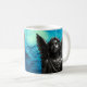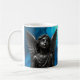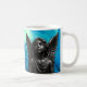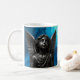 Un elegante ángel negro-metalizado con alas reflectantes y ojos azules vivos se alza frente a un fondo verde azulado-acuático, con texturas de hielo, creando un contraste nítido y un ambiente fresco y etéreo. Perfecto para fanáticos del arte de fantasía, amantes de la decoración gótica y espacios modernos que buscan una declaración llamativa sobre tazas, arte mural y ropa.