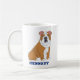 Crea un regalo personalizado que es perfecto para los amantes del perro y los dueños de perros. Esta taza de café presenta un ilustracion de estilo realista de un bulldog inglés de color marrón claro y blanco. Debajo del gráfico hay un punto para añadir un nombre con letras azul marino en negrita. El ilustracion y el texto aparecen a ambos lados de la taza.