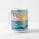 Pretty seaside coastal coffee cup with a gorgeous ai impasto oil painting style illustration of blue ocean waves crashing on a sandy beach, that is covered in sea glass and surrounded by palm trees at sunset and sunrise.