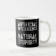 Un diseño humorístico con un robot con una burbuja de pensamiento que dice "Inteligencia Artificial" y un humano con una burbuja de pensamiento que dice "Estupidez natural". Una manera divertida de burlarse de las diferencias entre humanos y máquinas.