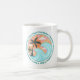 Sencillo tazón clásico con aspecto de café o taza de té con divertida imagen retro Ilustracion de colores de palmeras verdes, olas azules, sol naranja y rayos de sol amarillos y rosados. Rodeado de palabras relacionadas con el verano... Olas, Fiestas de playa, buenas vibraciones, cócteles, verano, amigos, risas, sol y surf. Copas de Guay para uso en fiestas de playa o patio trasero y para tener en reserva en su patio o bar de tiki junto a la piscina.