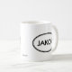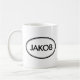 ¡Compruebe hacia fuera esta taza de Jacobo! ¿Es su nombre Jacobo? ¿O usted tiene un marido, un novio, un miembro de la familia masculino o un varón Jacobo nombrado amigo? ¡Si es así esta taza del "sello conocido" es exactamente el regalo que usted está buscando! Las características del diseño "Jacobo" en las letras negras grandes rodeadas por dos óvalos, uno fino y uno grueso.
