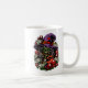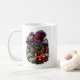 The January zombie witch with January's flowers and gems. She wearing a purple hat with a red band and a patch. She has green skin, glowing green eyes, and sharp teeth. An orange cape is draped around her shoulders, fastened with a skull clasp. The witch is surrounded by white carnations and red garnets, set against a black background. The overall mood is spooky and fantastical.