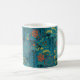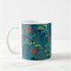 Las golondrinas oscuras se abalanzan sobre un fondo azul verde azulado con texturas, lleno de glicinas, flores rojas y doradas y otros elementos tradicionales japoneses en esta hermosa oda a un jardín japonés y diseño asiático.