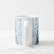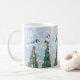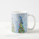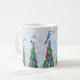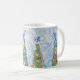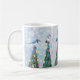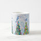 grifos azules y árboles de Navidad - ilustracion de Sarah Knight. La imagen muestra 5 pinos verdes y verdes adornados con luces de Navidades azules, amarillas y rosas. Por encima de cada árbol se sienta una marea azul (Cyanocitta cristata). Los pájaros son azules zafiro con bandas blancas y negras en sus plumas. El cielo es azul bebé y está lleno de copos de nieve. Es una escena de invierno caprichosa.