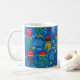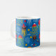 Silenciosa, colorida, divertida, caprichosa medusa y pulpo con sombreros, gorras burlones, pelo rizado, ojos, sonrisas y algunos llevando zapatos en un fondo azul con estrellas de rojo y oro.