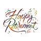Pintura acuarela de las palabras "Feliz Jubilación" en un colorido estilo festivo, con confetti y serpenteantes esparcidos alrededor del texto. Las letras están pintadas con un gradiente de colores, pasando del rojo al naranja al amarillo al verde al azul a violeta. Los confeti y las serpentinas también están pintados en varios colores, añadiendo un toque de celebración a la imagen. El fondo es blanco.