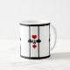 Perfecto para las bebidas en la Noche de Póquer o su próximo Fiesta de tarjetas, este tazón de café personalizado presenta un diseño original inspirado en el Art Deco con un tema de juego de cartas compuesto por 4 juegos de símbolos de traje de tarjeta rojo y negro brillante (diamante, trébol, corazón y pala) con un campo de texto personalizado para su monograma en el centro, fijado en un fondo blanco de nieve con rayas verticales verticales negras gruesas y gruesas y delgadas y gruesas y delgadas.