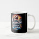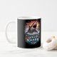 A fierce great white shark bursts from crashing waves at sunset, jaws wide as seabirds wheel over the glowing ocean.