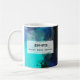 Una taza personalizada - con un diseño abstracto divertido y moderno. Pintar salpicaduras, salpicaduras y salpicaduras de azul turquesa, blanco, naranja y azul marino. El texto dice: debe tener café. Gracioso.