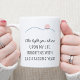 Taza de café con logotipo de sol abstracto "La luz que brillas" cita motivadora Feliz cumpleaños... El dicho motivador en nuestra taza de café personalizada dice "La luz que brillas en mi vida se ilumina con cada año que pasa" en letra de moda y tipografía sans serif clásica. Una simple ilustración de arte de línea de un sol polvoriento rosa sobre colinas onduladas de color verde azulado refuerza el mensaje de luz. Agrega el nombre del cumpleañero a través de la plantilla de personalización. Regalo de cumpleaños sincero de un padre, abuelo, hermano o mejor amigo. Cita original de Barbara Casey.