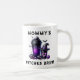 Testigos de mamá preparan café de Halloween Mug - Dale a mamá el regalo de la paz y la risa con esta encantadora y divertida taza de café de Halloween. El diseño incluye una taza de café con temática de bruja decorada con lámparas jack-o' y calabazas en tonos negros y púrpura, con murciélagos volando a lo lejos. La taza muestra la divertida frase ‘Mommy's Witches Brew’ en una tipografía retro grunge de inspiración vintage. Ideal como regalo de Halloween para nuevas madres, madres de niños pequeños y preescolares, y madres ocupadas y cansadas que aman el café y su cafeína. Esta singular taza de Halloween combina diversión festiva con practicidad cotidiana, lo que la convierte en una adición perfecta a la colección de café de cualquier madre.