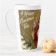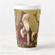 This vintage-style holiday mug features a classic illustration of Santa Claus dressed in a traditional long red robe with white fur trim, carrying a sack overflowing with dolls and toys over his shoulder. He stands alongside a large reindeer, holding its leather bridle against a textured, gold-colored background. The scene is framed along the bottom by festive boughs of holly with red berries and mistletoe with white berries,