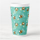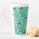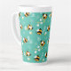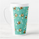 Caneca de café latte com ilustração azul de abelhas fofas com flores.
