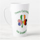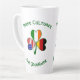 Gran taza de latte personalizada con las banderas de Alemania, Irlanda y los Estados Unidos de América o los Estados Unidos de América dentro de un shamrock con una cola atrevida. Se sienta en un fractal de cuadrados verdes y claros. Arriba están las palabras TRES CULTURAS, en letras de color verde oscuro, circular, de estilo celta. Debajo, en letras similares están las palabras ONE YOURNAME. Al añadir tu nombre en el lugar correcto se añade un toque personalizado. Añadir el nombre de otra persona crea un regalo. Un delicioso regalo para el cambio de hogar. Único para reuniones familiares, Oktoberfest, 4 de julio y el Día de San Patricio.