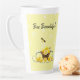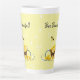 Esta gran jarra de latte presenta un diseño compuesto por una cesta de limones con una pequeña abeja, sobre un fondo amarillo. En la parte delantera y trasera de la taza están las palabras "¡Bee Beautiful!"