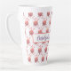 Hilados de punto y agujas altas de latte mug con un lugar para personalizar con un nombre o un dicho corto. Colores rosa y violeta. El texto de ejemplo es "{Name's} tejiendo espíritus" en un guión morado en el centro de una taza blanca. Dos agujas de punto pegadas en una bola de hilo variado hacen un patrón divertido alrededor de una taza alta o corta.
