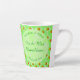 Este impresionante latte mug presenta un patrón de flores de manzana rosa pálido en bonito. Son de dos tonos rosas diferentes y todas tienen un centro amarillo. Son ideales para una boda de primavera y se mezclan entre manzanas. Cada manzana es verde, con un rubor rojo en un lado y un pequeño tallo marrón. Hay un círculo verde pálido con motivos de mármol blanco que contiene texto de personalizable para poder incluir todos los detalles importantes.