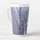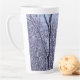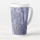 Esta foto digitalizada, gráfica, de un bosque desnudo y arbolado, mostrada en tonos mudos, violeta, morado, azul, blanco, gris y negro, se representa en el trazo, rastros de, un pálido, azul, crepúsculo.