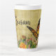 Esta taza de latte floral de estilo rústico sería un regalo considerado para ella. Esta taza presenta un diseño botánico sobre un fondo de acuarela dorada. Añadí una mariposa monarca al diseño. Personalice esta taza con su propio texto o nombre.