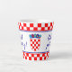 Esta taza de café con leche muestra un saludo croata "Dobro jutro!" por un lado y la versión en inglés "¡Buenos días!" por el otro lado. Hay dos filas de damas rojas y blancas, así como delgadas franjas rojas, blancas y azules en la parte superior e inferior de la taza. El texto es personalizable, y la fuente caligráfica azul coincide con el color de la bandera croata. En el medio está el escudo de armas (grb en croata).