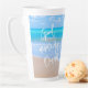 Alto latte mug con la escena azul del océano. "Buenos días océano" está escrito en un ángulo de un lado. El agua tropical azul Aqua se desliza en la orilla de arena. Una forma maravillosa de tomar un café con leche y empezar el día. Cambie la redacción como desee.