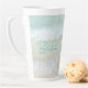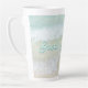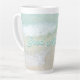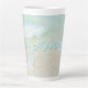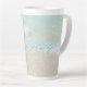 Taza de latte con escena de playa y texto "buenos días", o cámbialo / elimínalo. Esta taza alta tiene una imagen de playa tropical con agua tropical ligera, oleaje blanco y arena de playa. La letra es script en color verde espuma de mar con efecto de sombra.