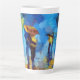 Esta taza de café con leche personalizado presenta una pintura a mano de una pareja que lleva un paraguas mientras caen las gotas de lluvia. El fondo está formado por un paisaje artístico colorido.