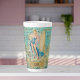 El gran mug de latte de aspecto vintage presenta un conjunto de chica de color rubio con un perno de material azul frente a un espejo dorado en pie sobre fondo de oro y ephemera verde azulada. Personalización con nombre o monograma