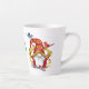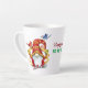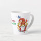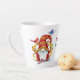 Este lindo tazón de Navidad presenta un pequeño gnomo grande, blanco barbudo, gracioso, que usa un Sombrero Santa rojo y dorado adornado con imágenes de renos. ¡Se está metiendo un poco en la cinta de oro que tiene! Dos pájaros, un cardenal rojo y un cardenal azul, le colocan. La imagen se coloca en dos lados de la taza, con texto personalizado en rojo y verde en el medio que dice "Happy HO HO". ¡Qué lindo!