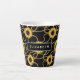 Latte mug con un elegante y elegante patrón. girasoles amarillo bonito y hojas verdes rodeadas de delicadas cadenas de oro. Fondo negro. Un rectángulo negro con un borde blanco sobre la parte superior con tu nombre personalizado dentro.